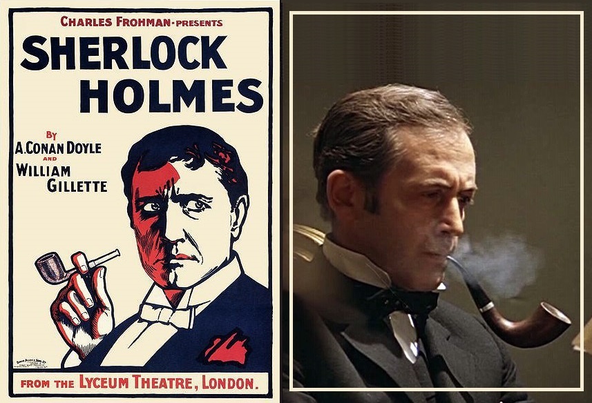 Конечно, времени, как всегда на всё задуманное не хватило. Полтора часа – миг на фоне полутора столетий. Странным и подозрительным образом выпал из папки с файлами образ Холмса в рисунках американского художника Фредерика Д. Стила, пришлось рассказывать о нём на пальцах. А ведь это был этапный в своём роде образ. Впервые Холмс шагнул из кино (и театра) в книжную иллюстрацию именно под карандашом / пером / стилусом Стила. На заре синематографа – в самом начале ХХ века! Прообразом для него послужил американский актёр Уильям Джиллет, выступавший в роли Холмса на сцене и на киноэкране. В современном книгоиздании, не только российском, это заимствование образа из кино для переноса на книжную обложку или во внутренние иллюстрации – встречается сплошь и рядом.