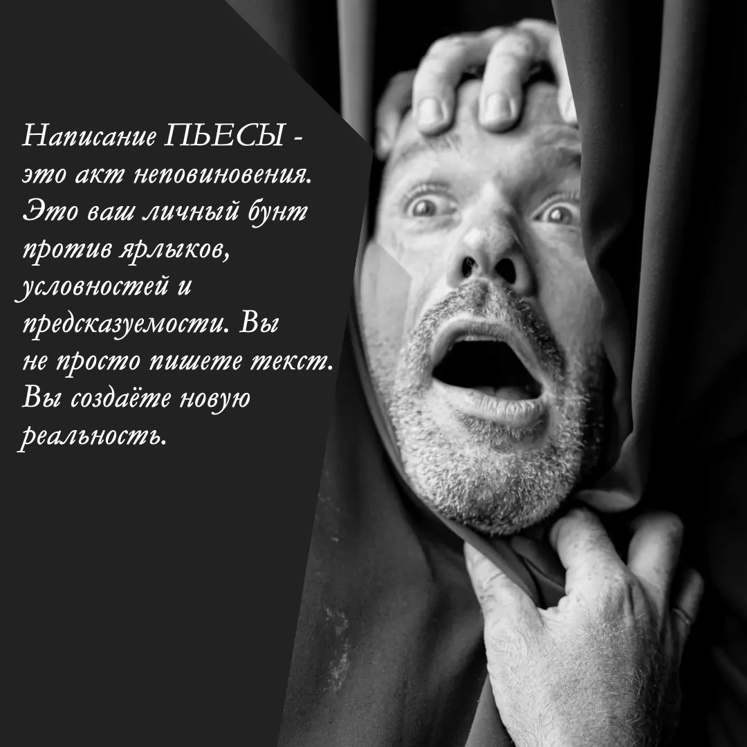 Написание пьесы - это акт неповиновения. Это ваш личный бунт против ярлыков, условностей и предсказуемости. Вы не просто пишете текст. Вы создаёте новую реальность. Реальность, где тихий голос может стать громким, где слабый может оказаться сильным, а тот, кого все считали «странным», – единственным, кто видит правду.