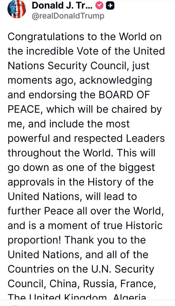13 стран поддержали, в Россия и Китай воздержались при голосовании за утверждение плана Трампа, включающего создание Совета Мира и ввод миротворцев сектор. Вот что написал Трамп по этому поводу: Поздравляю весь мир с невероятным голосованием Совета Безопасности ООН, которое состоялось всего несколько минут назад: СБ официально признал и утвердил Совет мира (Board of Peace), который я возглавлю. В него войдут самые влиятельные и уважаемые лидеры мира. Это решение войдёт в историю как одно из крупнейших одобрений в истории Организации Объединённых Наций, станет шагом к дальнейшему укреплению мира по всему миру и является моментом по-настоящему исторического масштаба! Благодарю Организацию Объединённых Наций и все страны — члены Совета Безопасности: Китай, Россию, Францию, Великобританию, Алжир, Данию, Грецию, Гайану, Южную Корею, Пакистан, Панаму, Сьерра-Леоне, Словению и Сомали. Также благодарю страны, которые не входят в состав Совета Безопасности, но активно поддержали эту инициа