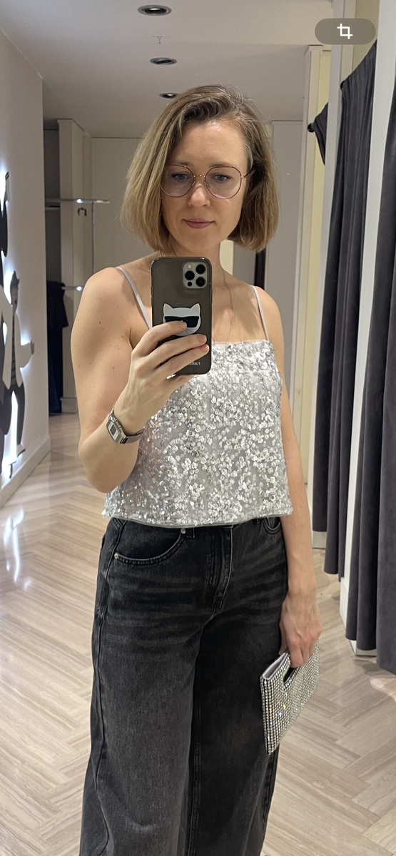Приветствую вас, дорогие читатели! Совсем скоро начнутся новогодние корпоративы, пора присмотреться к праздничным коллекциям и благо, в бюджетных брендах есть из чего выбрать. Лучшее, что успели ухватить мои взгляд и руки, это новогодняя коллекция в Sela. Ассортимент внушительный, в одну статью поместить можно, но будет утомительно, поэтому предлагаю пробежаться по коллекции, как говориться "широкими мазками". Но основное, на чем хотелось бы с акцентировать внимание, это топы. Топы - самые бюджетные и самые вариативные. Отлично смотрятся в любыми низами: юбками, брюками, джинсами и прекрасно сочетаются с любыми верхами: пиджаками, кардиганами, джемперами. Первым на примерку я взяла укороченный топ в пайетках. Оказался очень комфортным, топ на подкладке из тонкой сатиновой ткани в тон, тонкие бретели с регуляторами длины. С джинсами на высокой посадке тело не мелькает. Кстати, впервые примеряла джинсы gaucho, были опасения, что они зрительно искривят ноги и сделают меня похожим на кавал