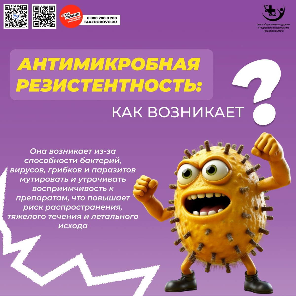 🔬 Началась Неделя борьбы с антимикробной резистентностью! Мы часто слышим этот термин, но как именно она возникает? Представьте себе армию микробов (бактерий, вирусов, грибков). Когда мы применяем противомикробный препарат, он уничтожает самых слабых. Но некоторые, самые сильные и хитрые, могут выжить благодаря случайной мутации. Эта мутация дает им «суперспособность» — устойчивость к лекарству. Что происходит дальше? ➡️ Эти «супермикробы» выживают и размножаются. ➡️ Они передают ген устойчивости своим «потомкам». ➡️ Вскоре появляется целая армия микроорганизмов, на которую лекарство больше не действует. Чем это опасно? Это сводит на нет все достижения медицины! Обычные инфекции снова могут стать смертельно опасными, а обычные операции и химиотерапия — невыполнимыми из-за риска неизлечимых инфекций. #АнтимикробнаяРезистентность #НеделяБорьбыСАМР #УстойчивостьКАнтибиотикам #Здоровье #здоровоебудущее #ЗдоровоеБудущее62 #ЗдороваяРязань