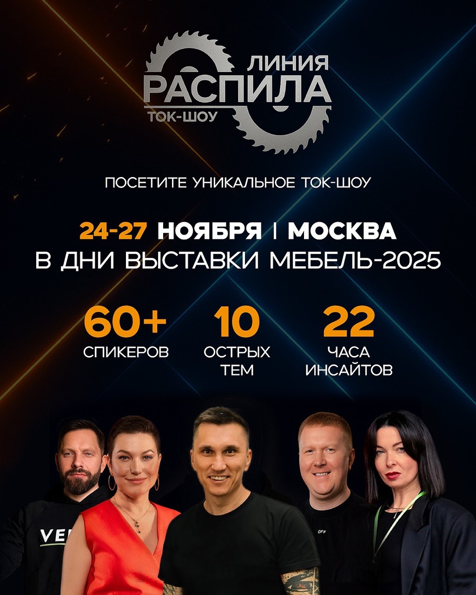 Обновляется не только «Мебель», но и деловая программа: на выставке впервые пройдёт ток-шоу мебельной индустрии 🎙 Мебельная индустрия сегодня переживает переломный момент: рынок насыщается, конкуренция растёт, а технологии обновляются быстрее, чем успевают выходить каталоги материалов. В это время отрасли особенно нужен формат, где можно открыто говорить, спорить, делиться опытом и искать реальные решения. Поэтому не удивительно, что у выставки «Мебель» обновляется не только площадка (МВЦ «Крокус Экспо»), но и мероприятия деловой программы. 🔊 Речь идёт о ток-шоу «Линия распила». Это не конференция и не презентация — это пространство реального диалога, где каждый участник может высказать мнение, задать вопрос и услышать аргументы коллег. Организатором выступает компания LIGA. 👨💻 Нам это событие интересно не только своей новизной, но и тем, что там обсудят темы, актуальные как для малого и среднего, так и для крупного бизнеса. Ведь для СМИ нет ничего важнее, чем идти в ногу с от