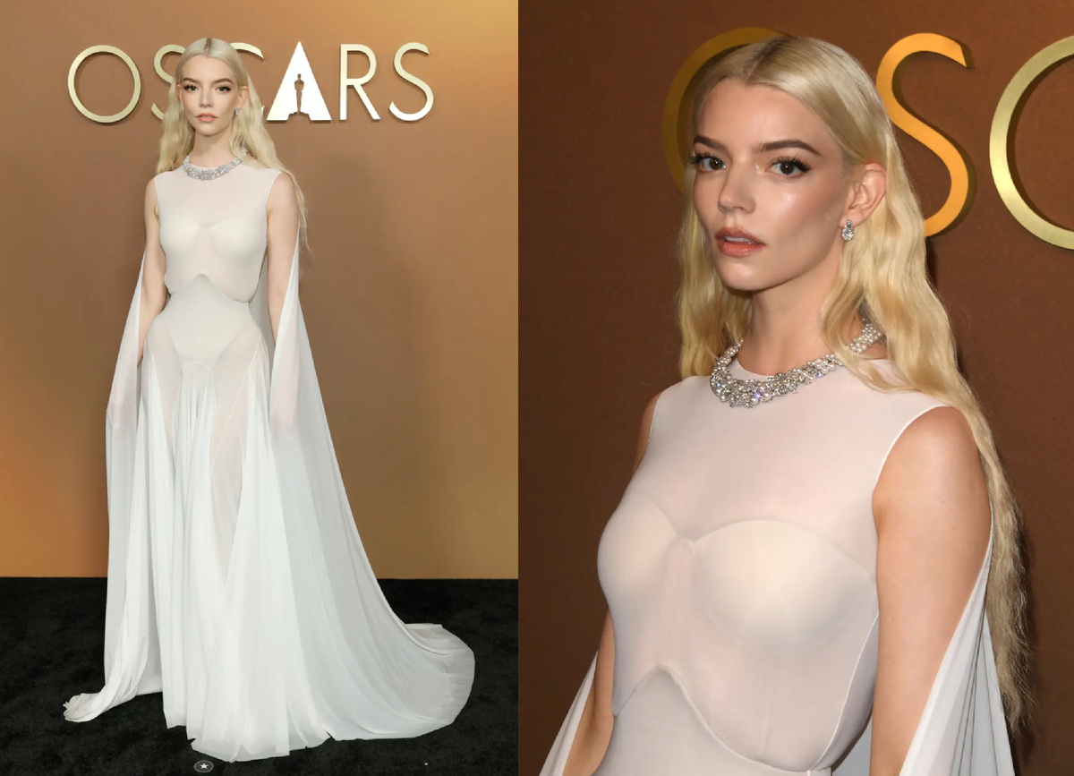 На Governors Awards Аня Тейлор-Джой стала главным визуальным акцентом вечера. Она вышла в прозрачном белом Maison Margiela Couture, который на красной дорожке выглядел как чистое свечение. Корсетная линия. Тончайшие многослойные складки, придающие эффект лёгкости юбки. И мягкий шлейф, плавно спадающий с плеч. Всё это собрано в силуэт, напоминающий ангельскую иллюстрацию высокой моды. Ювелирные акценты она выбрала особенно внимательно. На ней были украшения Tiffany and Co. Колье с жемчугом Akoya и бриллиантами, серьги подвески, а также знаменитое кольцо Soleste. Эти детали дали ровное мягкое сияние, подчёркивающее чистоту белой палитры. Платье впервые показали на кутюрном подиуме Maison Margiela. В дефиле модель выходила с белой вуалью на лице, которая стала частью художественной концепции коллекции. Чуть раньше Ким Кардашьян выбрала другой вариант того же силуэта на Academy Museum Gala. Она вышла в нюдовом корсетном платье и именно с тем самым аксессуаром, который закрывал лицо. Кома