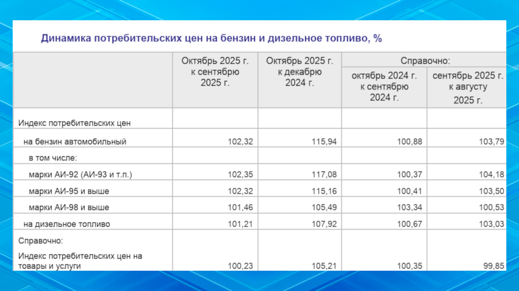 Брянскстат сообщает о зафиксированном незначительном росте цен на бензин и дизельное топливо в октябре этого года. Лидером подорожания, как обычно, стал бензин марки АИ-92. Индекс потребительских цен на бензин в октябре по сравнению с сентябрем на АЗС в Брянской области составил 102,32 процента. При этом сентябрьские цены по сравнению с августовскими оказались выше на 3,8 процента. Такие данные приводит в оперативной сводке Брянскстат. Больше всего в цене подрос самый ходовой и дешевый бензин АИ-92 – на 2,35 % в октябре и 4,18 % в сентябре. АИ-95 и выше подорожал на 2,32 % и 3,5 % соответственно. Автомобильный бензин марки АИ-98 и выше, который не из дешевых, ожидаемо подрос в цене незначительно – 1,46 %. В сентябре его цена практически не изменилась по сравнению с августом. Подорожание дизельного топлива даже на фоне роста цены на бензин с высоким октановым числом оказалось невелико – на 1,21 %. Хотя еще в сентябре цена на него подскочила более чем на 3 %. Ранее сообщалось, что индекс