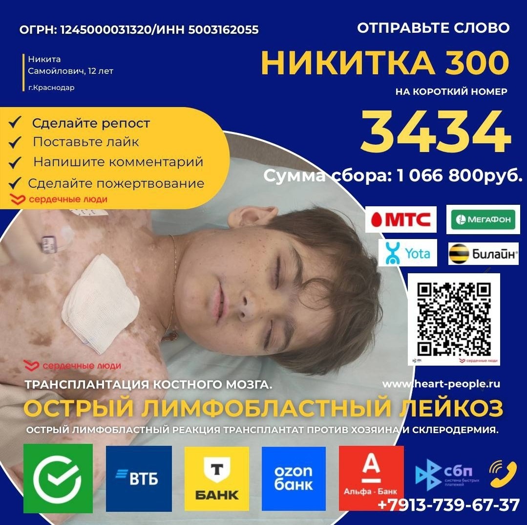 Никиту бросил отец, когда узнал о его диагнозе - рак! Бросил малыша двух лет и ушел, оставив жену и ребенка одних в сложной ситуации, без денег, без шанса на жизнь! Никита не умер, Никита выжил в борьбе, где никто не смог бы… благодаря стараниям его мамы, ее надежде и силе духа! Мамы, бабушки, девушки, женщины - только вы поймете эту бесконечную боль и несправедливость …. Лечение необходимо каждый месяц, каждый месяц тяжелых реабилитаций, боли, отчаяния и надежды! Алименты составляют 3.000 рублей… дальше и слов нет. И вот, крохотная сумма, как насмешка судьбы, должна обеспечить ребенку шанс на жизнь. Шанс, который украла болезнь, усугубленная предательством. 3.000 рублей… Этого не хватит даже на один день в больнице, не говоря уже о дорогостоящих препаратах, реабилитации и специализированном питании. Как объяснить маленькому Никите, почему отец отвернулся? Как рассказать ему о финансовой беспомощности, когда в глазах ребенка лишь страх и желание жить? Эти вопросы разрывают сердце ма
