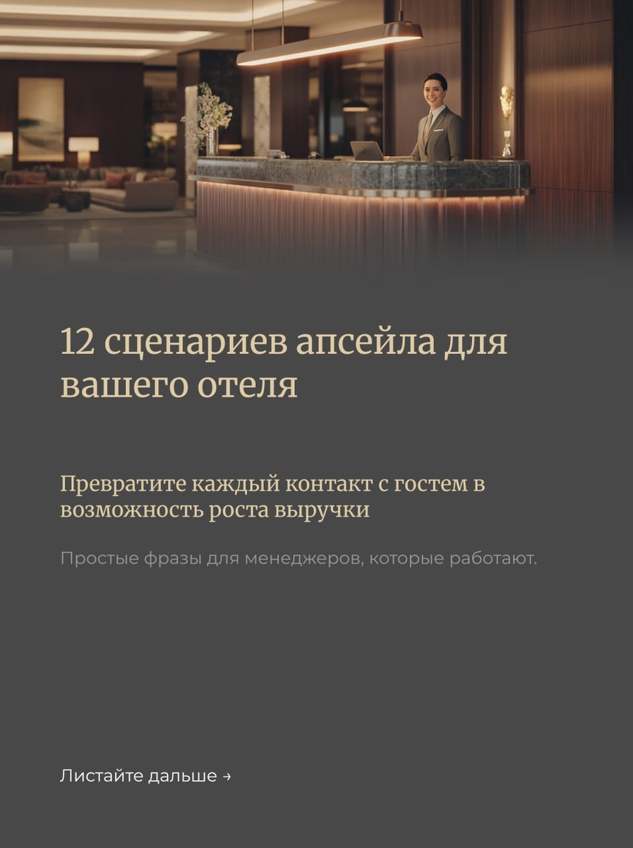 12 сценариев апсейла В карточках примеры, а не догмы. Перед запуском адаптируйте под ваши цели и ожидания гостей. Подготовительная работа нужна обязательно! ❗️Сегментируйте гостей и зафиксируйте триггеры (рейсы, дети, погода и т. п.). ❗️Привяжите предложения к CJM: где именно и кем звучит фраза. ❗️Посчитайте юнит-экономику и лимиты микро-бонусов. ❗️Настройте CRM-теги, шаблоны фраз и обучите фронт (тон, тайминг, 1–2 касания в сутки). ❗️Согласуйте SLA(Service Level Agreement — соглашение об уровне обслуживания) с бэком: кухня, хаускипинг, парковка. ❗️Запустите A/B тестирование и измеряйте: attach rate, RevPAR, NPS(Net Promoter Score — индекс потребительской лояльности), повторные брони. ❗️Раз в неделю — короткое ревью и доработка формулировок. Главное правило: одно релевантное предложение на микромомент, максимум два в сутки для одного гостя — так апсейл будет уместным и сработает на лояльность. Все еще жду вашей обратной связи здесь🙂 P.S.: здесь 5 сценариев, еще 7 выйдут сег