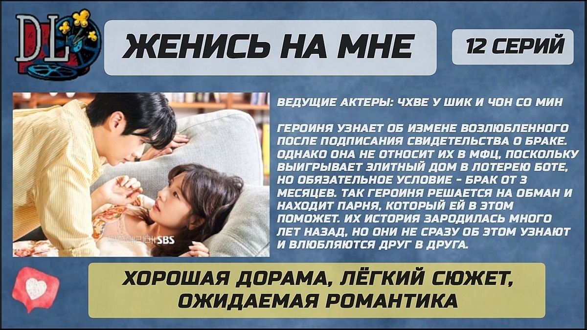 Отзыв это или рецензия решайте сами, я уже не понимаю что это 😂 Ведущие актеры: Чхве У Шик и Чон Со Мин Пробежимся по сюжету: Героиня узнает об измене возлюбленного после подписания свидетельства о браке. Однако она не относит их в МФЦ, поскольку выигрывает элитный дом в лотерею ЖК Боте, но обязательное условие - брак от 3 месяцев. Так героиня решается на обман и находит парня, который ей в этом поможет. Их история зародилась много лет назад, но они не сразу об этом узнают и влюбляются друг в друга. К тому же парня тоже зовут Чхве У Джу. Совпадение ли это или судьба? Мы все сможем преодолеть, пока вместе. Я всегда буду рядом с тобой. Насчёт второй парочки. Лучше бы их играли другие актёры. Не могу ничего сказать, но мне они вообще не понравились, я поняла, что хотел сказать сценарист, но я была готова мотать, когда они появлялись в кадре. Либо персонажи непрописаннные, либо сняли так кургузо и актёры не вытянули, не знаю, мне они не понравились из-за них дорама получила минус 1⭐
