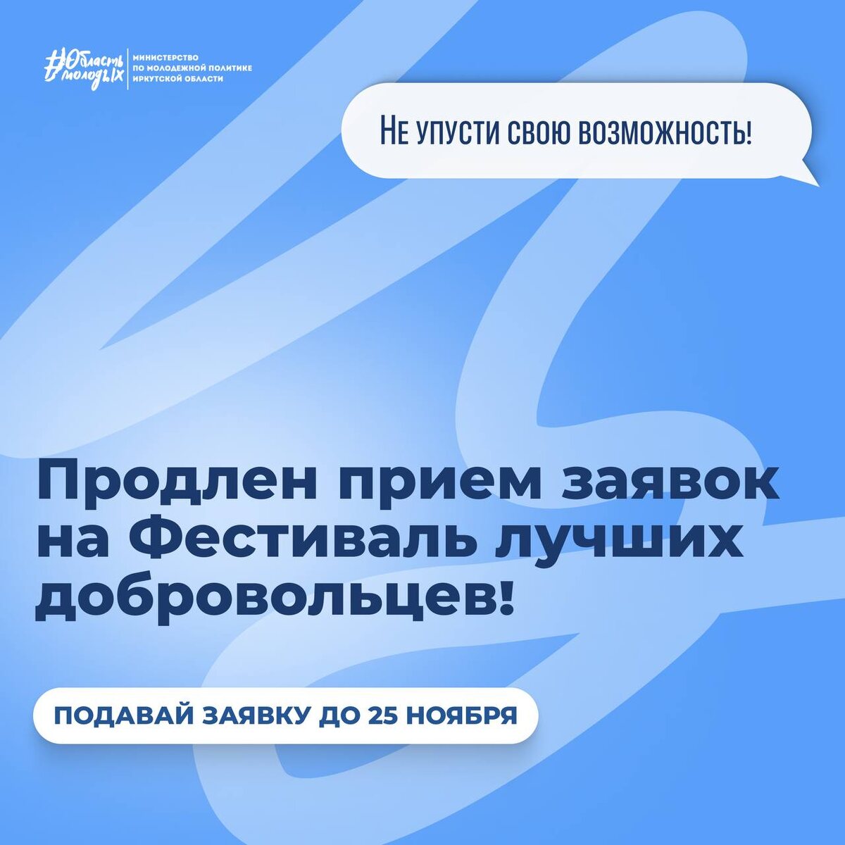 🔥Хорошие новости! Продлен прием заявок на Фестиваль лучших добровольцев! Волонтёры Приангарья, напоминаем, что продолжается приём заявок на главный добровольческий праздник года - Фестиваль лучших добровольцев Иркутской области! ⠀ Рассказываем алгоритм участия: 1️⃣Написать искренний пост на своей странице ВК на тему «Что значит – «быть добровольцем» для меня?»; 2️⃣Обязательно добавить хэштеги: #ОбластьМолодых #ДобронаБайкале #ИРВЦ и отметки сообществ ВК; 3️⃣Пройди регистрацию до 25 ноября. ➡️ Ждём именно тебя 5 декабря в Доме молодёжи, где мы вместе подведём итоги года, наградим героев конкурсов «Почётный доброволец», «Лучший доброволец» и «Фокус на добро», а также зарядимся идеями для новых свершений! Не упусти шанс стать частью большого праздника добра, познакомиться с единомышленниками и наполнить холодную зиму теплыми воспоминаниями!⚡️ Мероприятие реализовано в рамках федерального проекта «Мы вместе (Воспитание гармонично развитой личности)» национального проекта «Молодежь и
