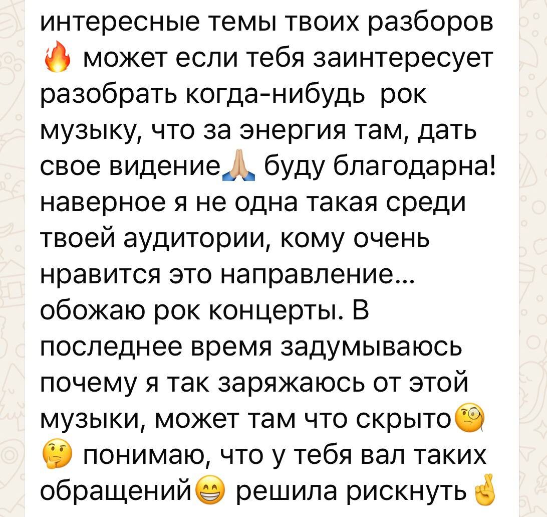 #разборы #рокмузыка Рок-музыка как эгрегор Сегодня разберу один из самых мощных эгрегоров современности, меняющих сознание миллионов — рок‑музыку. С 50‑х годов рок не просто звучит: он форсирует перемены и остаётся ярким символом эпохи. Что такое рок? Само слово — предвестник судьбы и неотвратимости. Оно дарит голос той силе, которой мало кто в музыке может дать выход. Если классика — это отточенная красота и упорядоченный верх, то рок — это рёв земли, её зов и мощнейший выброс энергии. Энергетически рок подобен раскату грома: звуковая волна, которая не просто проходит через тело, а зажигает клетки, подталкивает к перерождению. Эгрегор рока умеет перерабатывать тяжёлые энергии — не накапливать груз, а освобождать его. Каждый поджанр рок‑музыки прокачивает свои эмоции. Дум‑металл работает с глубинной болью и тенями, панк‑рок зовёт на бунт, эйсид‑рок отсылает в психоделическое и бессознательное, хардкор даёт выход агрессии, эмокор — разрешение внутренней драмы. Все эти подвиды возде
