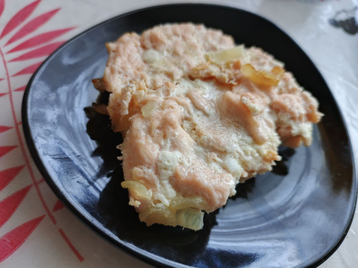 Красная рыбка. Лосось. Отделить от кожи, костей. Мелкие кусочки рыбки (филе) смешать с яйцом. Слегка посолить. На сковороде чуть прижарить лучок до золотистого цвета. На растительном масле, естественно. И Вылить на лук яично-рыбную смесь. Закрыть крышкой. Переключить огонь на слабый. Ждать до готовности. Приятного аппетита! П.С. При готовке выделяется сок (бульон). Слить в отдельную чашку. В этом блюде он не нужен. П.С. Блюдо приготовлено без какой-либо панировки. Так задумано.