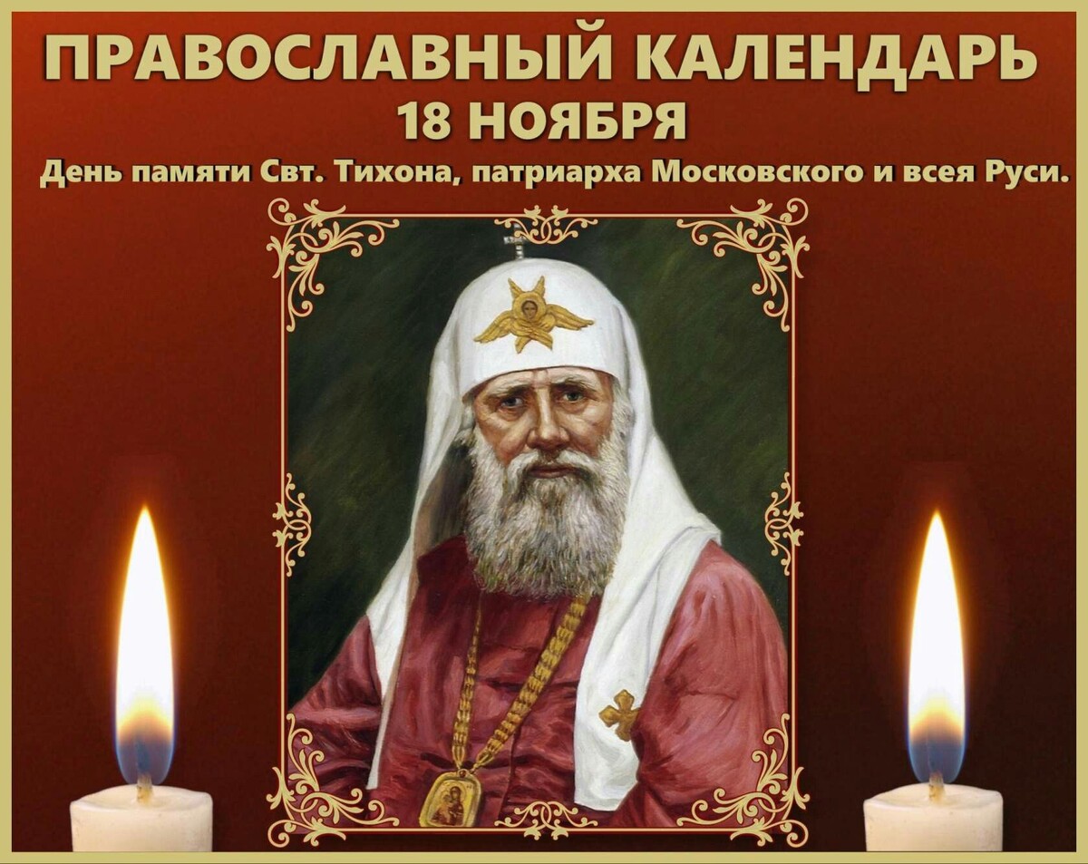 18 ноября 2025 года - вторник, седмица 24-я Православная Церковь чтит память: — Мучеников Галактиона и Епистимии (III) — Святителя Ионы, архиепископа Новгородского (1470) — СвятителяТихона, патриарха Московского и всея Руси (избрание на Патриарший престол 1917) — Отцов Поместного Собора Церкви Русской 1917–1918 годов — Священномученика Гавриила Масленникова, пресвитера (1937) -------------------------------------------- Поздравляем всех именинников с днем Ангела! Галактион, Епистимия, Иона, Тихон, Григорий, Гавриил ---------------------------------------- 🍵 ПОСТ И ТРАПЕЗА 18 ноября 2025 г., вторник, поста нет ---------------------------------------- ИСТОРИЧЕСКИЕ СОБЫТИЯ — 18 ноября 1699 г. император Петр I издал указ о формировании регулярной армии — 18 ноября 1775 г. издан манифест о новом областном делении России — 18 ноября 1942 г. завершилась героическая оборона Сталинграда в ходе Великой отечественной войны — 18 ноября 1979 г. родился митрополит Донецкий и Мариуполь