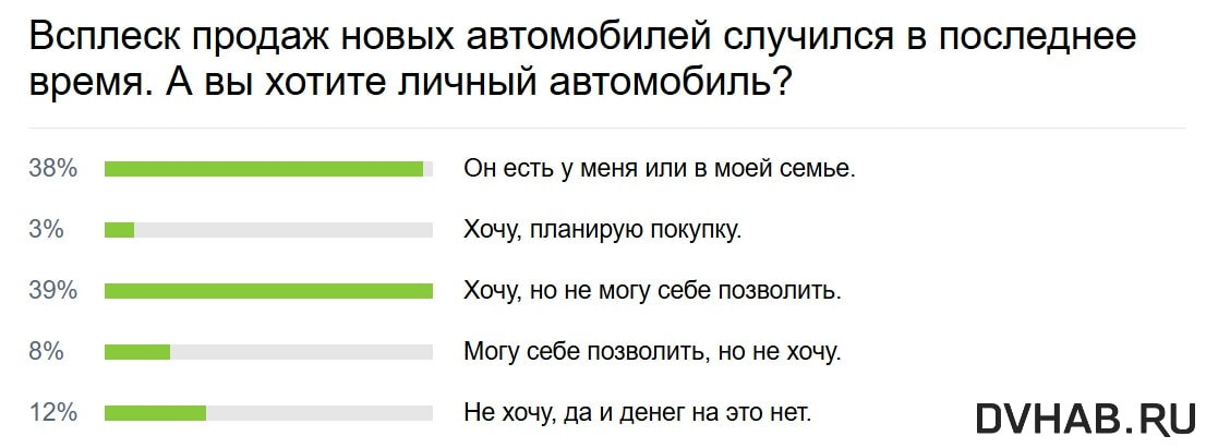 Мы решили поинтересоваться у хабаровчан, планируют ли они приобретать автомобиль. Вопрос актуален, в том числе, потому что в последнее время случился всплеск продаж новых машин. 39% заявили, что хотят, но на данный момент у них нет денег на приобретение транспортного средства. 38% сообщили, что автомобиль у них уже имеется. 12% машину покупать не хотят, да и денег на нее у них нет. 8% могут себе позволить автомобиль, но вот желания его приобретать у них нет. Оставшиеся 3% выбрали вариант ответа: «Хочу, планирую покупку». Отметим, что на главной странице DVHAB.ru каждую неделю проводятся опросы на самые актуальные и острые темы. Найти их вы можете, пройдя по ссылке. Напомним, ранее мы интересовались у хабаровчан, экономят ли они на покупках, когда идут по магазинам. 31% честно ответили, что стараются при прочих равных искать товары подешевле. 26% обращают внимание на ценники.