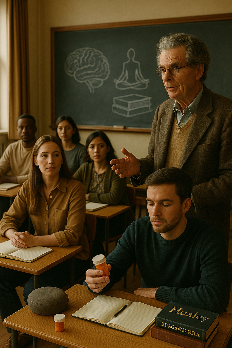 Во второй части речи Хаксли неожиданно делает поворот: он предлагает альтернативу фармакологическому пути развития — немедикаментозные практики, которые меняют не когнитивную скорость, а базовый уровень счастья.