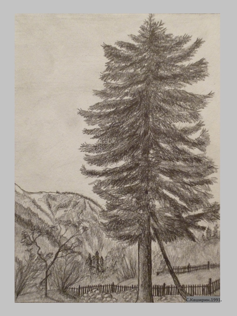 Художник, Степан Каширин. "Кедр".(30x20см.) Бумага, карандаш.1991г.