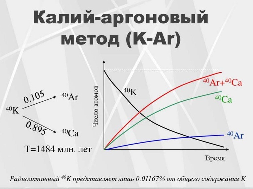Калий-40 (около 0.01% в природе) с периодом полураспада 1.248 млрд. лет распадается в кальций-40 (вероятность 89%) или аргон-40 (вероятность 11%).Аргон, будучи инертным газом сохраняется в несвязанном виде, а большой по сравнению с гелием размер атома аргона не позволяет ему покинуть решётку минерала.