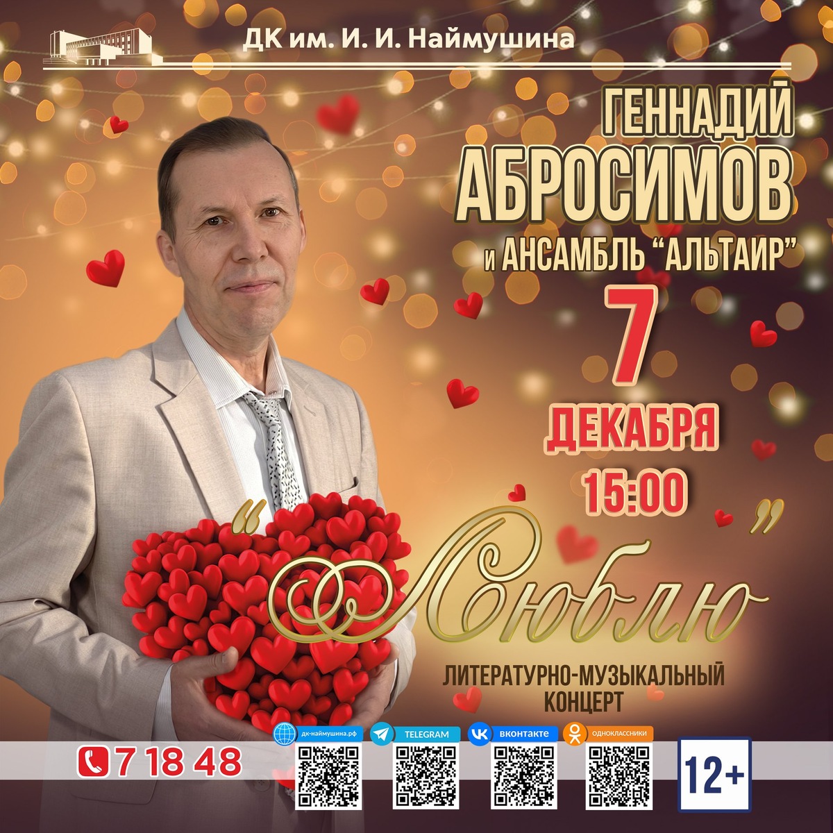 Приглашаем на музыкальный концерт о самом главном: - О любви к Родине, которая живёт в каждом из нас; - О любви к матери, что не меркнет с годами; - О любви к родным и близким, тем кто делает нас сильнее; В программе песни советской эстрады, знакомые каждому, а также современные хиты. Всё это - в исполнении солиста Геннадия Абросимова и вокального ансамбля «Альтаир» на музыкальном концерте «Люблю»! 📍 Дворец культуры имени И. И. Наймушина 7 декабря, 15:00 🎟️ билеты в кассе и на сайте https://center-kino.ru/221/release/10067259?date=2025-12-07