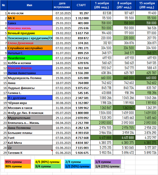 Всем привет! В этот раз у нас неделя прошла довольно скомкано из-за того что я протормозила с публикацией. Видимо, поэтому получилось так много прогульщиков. И я прошу обратить внимание тех, у кого прогул не первый, а тем более не второй раз подряд! Прогулы легко обнуляются при явке на ближайшую перекличку, а вот если этого не сделать, то наша таблица уменьшится ещё на пару строк. Ну а теперь перейдём к результатам. Сразу перейдем к нашим кубкам. Кто же погасил больше всех за неделю? На первом месте - Большие планы, погасившая 83024р! На втором - после долгого отсутствия Funt c результатом в 45091р, а на третьем - Анна Полякова, погасившая 18473р. А по результатам погашения в процентах к долгу в лидерах следующие участники: На первом А что если, чей долг уменьшился на 14,97%. На втором месте - Пенсионерка с кредитами, с результатом 5,83% и на третьем - Большие планы - минус 2,1% Поздравляем вас! Лидеры по погашению за весь срок марафона не изменились, а результаты всех участников вы м