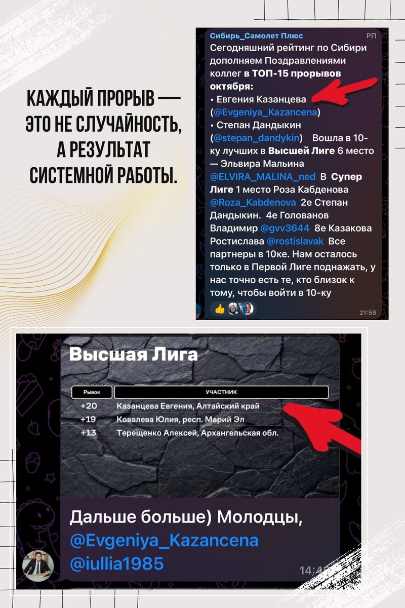 ⚡️Каждый прорыв — это не случайность, а результат системной работы. 🍂Октябрь снова порадовал: я вошла в ТОП-15 прорывов Сибири и поднялась сразу на +20 позиций в Высшей Лиге. 🏆Это прямой показатель того, что мы движемся в правильном направлении — к Первой Лиге, к новым сделкам, к новым победам. 💙Но знаете, что самое важное? — рядом команда, которая верит, поддерживает и тоже растёт. Мы не просто закрываем объекты — мы меняем рынок, делаем его прозрачным, честным и сильным. 🔝Дальше — больше. И мы туда обязательно придём. #самолетплюс #евгенияказанцева #перваялига #высшаялига #недвижимость #прорыв #команда