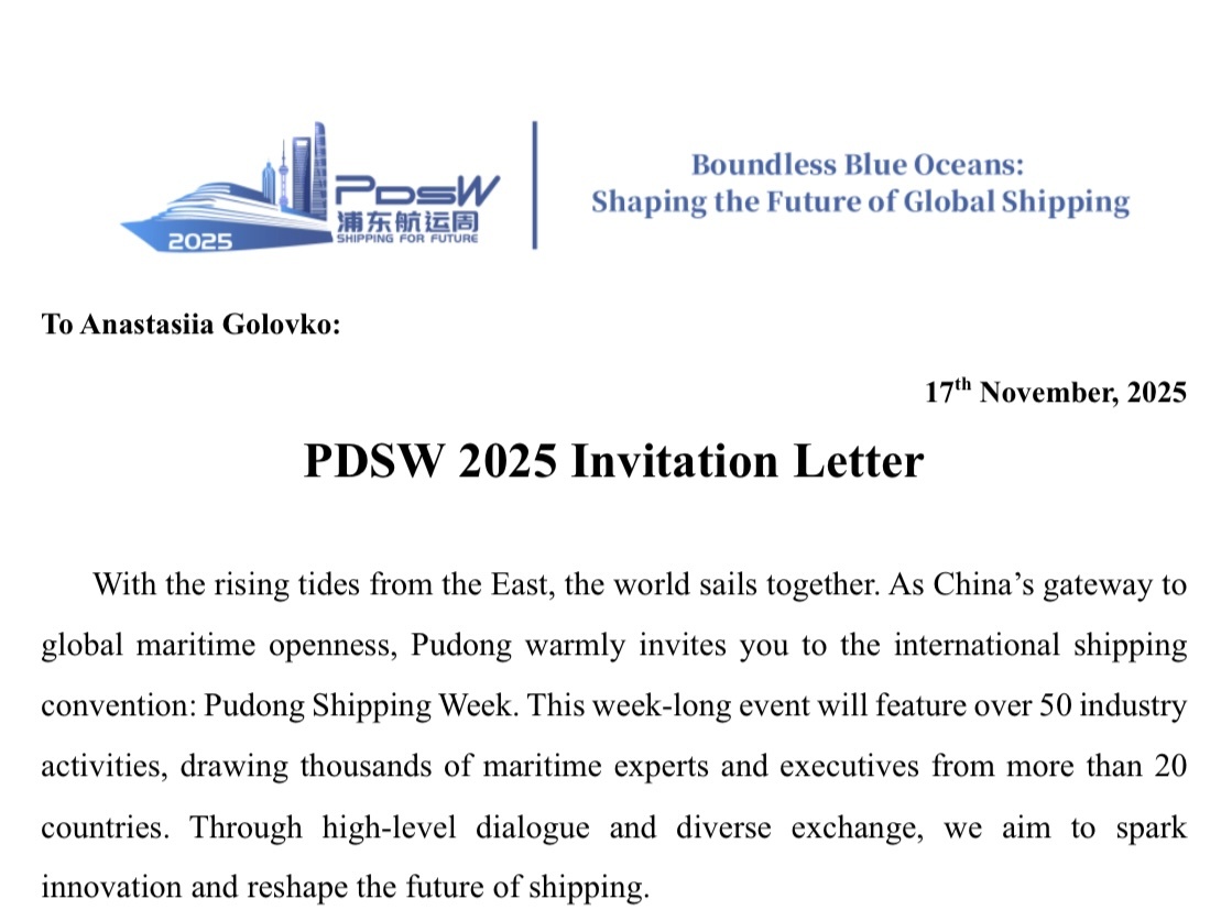 Сегодня я получила заветное приглашение на открытие Pudong Shipping Week Pudong Shipping Week это закрытое мероприятие высокого уровня, на котором собираются самые влиятельные китайские и международные корпорации для обмена опытом и контактами. В отличие от Дубая, где участия в разных конференциях почти всегда можно купить или пройти бесплатно, в Китае на мероприятия высокого уровня (особенно такие, как PSW) попадают только по личному приглашению. Получить такое приглашение равносильно жесту большого доверия и признания 🤝. Многие путают Marintec China и Pudong Shipping Week, но это совсем разные истории. Marintec China это большая выставочная конференция, павильоны которой могут посетить все желающие (за исключением различных частных мероприятий, на которые можно приобрести билет или пройти по приглашению от организатора). Pudong Shipping Week это закрытое мероприятие, созданное скорее для нетворкинга тяжеловесов морской индустрии, случайных людей там нет. Насколько мне известно, биле