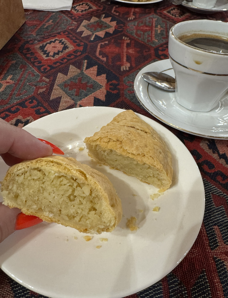 Я вам скажу, где они самые вкусные. Речь о Шекер-бура — нежных песочных пирожках с ореховой начинкой, которые являются настоящей гастрономической визитной карточкой региона. Представьте себе рассыпчатое, буквально тающее во рту песочное тесто, сделанное на основе топленого масла и сметаны. А внутри — сладкая, ароматная начинка из мелко помолотых грецких орехов (иногда с миндалем), смешанных с сахарной пудрой и кардамоном. Форма у шекер-бура особая — в виде полумесяца с изящным резным краем, который делается вручную с помощью специального щипца (маггаши). Этот узор — не просто украшение, он не дает начинке вытечь во время выпекания. 1. Тесто — это искусство. Его не замешивают, а скорее «собирают» руками, быстро перетирая муку с холодным топленым маслом, чтобы оно не успело нагреться. Именно это и дает ту самую уникальную, песочную текстуру. 2. Символизм в форме. Форма полумесяца — это не случайность. Она уходит корнями в историю и культуру. Полумесяц является одним из традиционных с