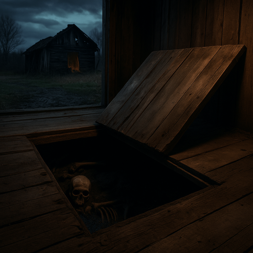У сарая звуки стали отчётливее. Там явно кто-то ворочался под полом. Я открыл дверь, вошёл. Луч фонаря выхватил стену, расписание «кормить», стеллаж… Пол возле люка поднимался и опускался, как если бы под ним кто-то лежал на спине и дышал.
