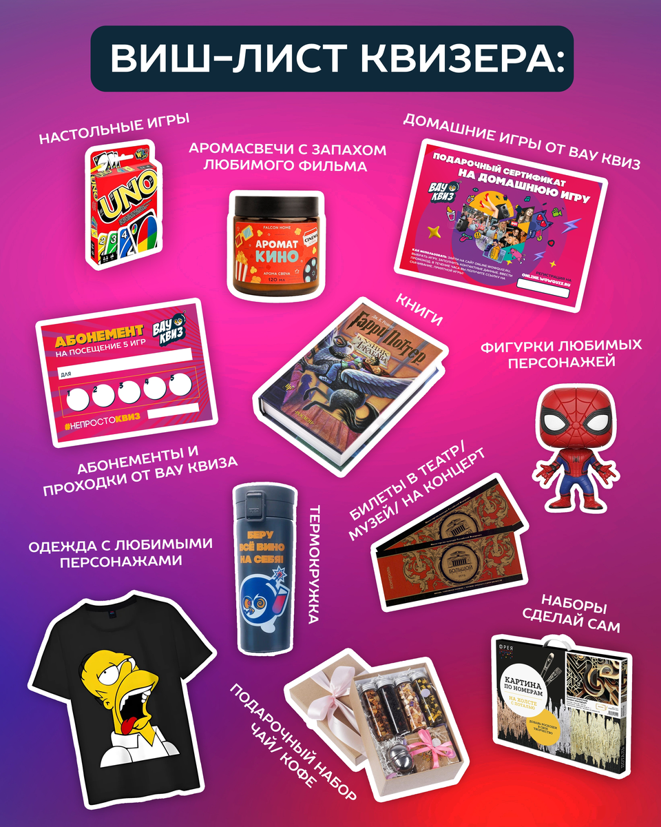 Если у тебя есть друг, который феерично справляется с угадыванием мелодий по реверсам и мэшапам, который помнит всех сестер Джо из «Друзей» и кричит «Ваууу!» на каждом правильном ответе — лови список подарков, которые приведут его в восторг. Дарите эмоции, впечатления и поводы чаще кричать «ВАУ!»: квизеры это любят. А какие подарки вы бы положили в свой виш-лист? #вауквиз #непростоквиз #этопростовау