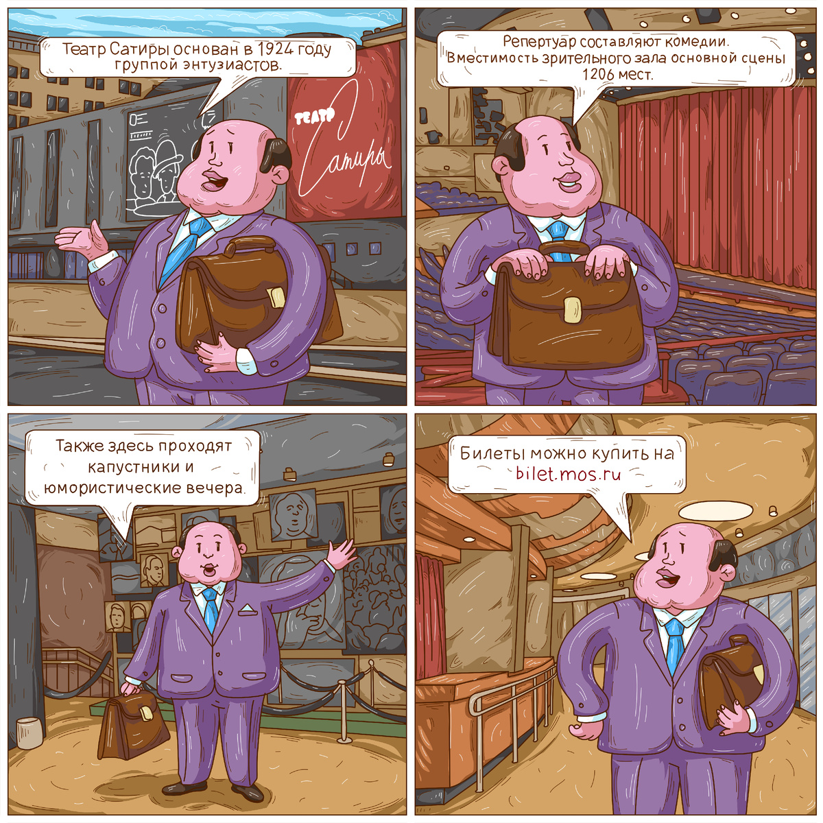 Сайт театра: https://satire.ru/ Театр Сатиры был создан в 1924 году не на пустом месте. Его основала группа актеров и режиссеров, которые специализировались на водевиле и оперетте. Изначальной задачей было создание современного советского водевиля и обличение мещанства и бюрократизма через смех. Первый спектакль так и назывался — «Москва с точки зрения».