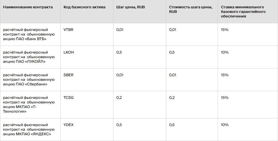 🏦 Новые фьючерсы на СПБ Бирже Сегодня в секции срочного рынка СПБ Фьюче появились новые инструменты. Они пополнили линейку уже существующих контрактов. Базисными активами новых фьючерсов стали обыкновенные акции крупных российских компаний: 🏦 ВТБ, ⛽️ ЛУКОЙЛа, 🏦 Сбербанка, 🏦 Т-Технологий, 📱 Яндекса. Размер контракта составляет одну обыкновенную акцию. Это фьючерсы с еженедельным исполнением с экспериацией (последним днём обращения) по четвергам. Исполнение контракта (проведение расчётов) осуществляется на следующий торговый день после экспирации контракта. Остальные технические параметры и наименования контрактов можно посмотреть на приложенном изображении🤩 Торги фьючерсами проводятся ежедневно с 10:00 до 00:00 по московскому времени. #Инвестиции