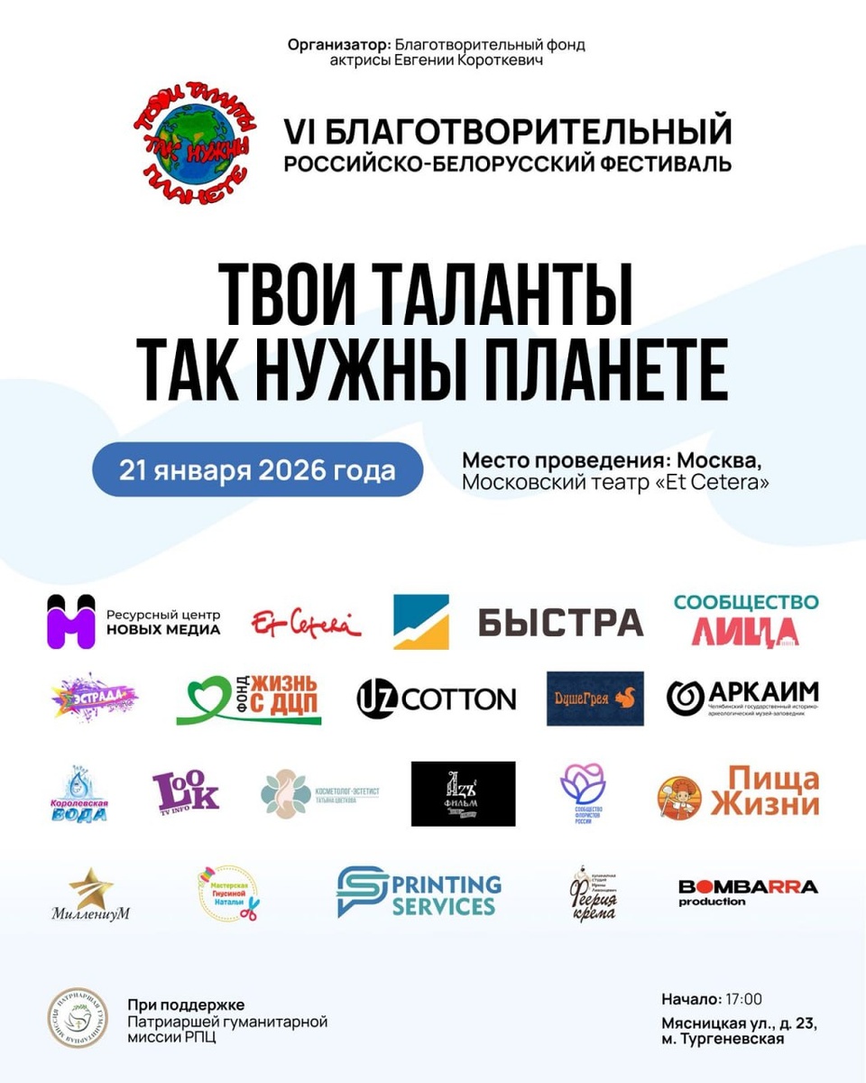 Москва ⭐️ Благотворительный фонд актрисы Евгении Короткевич при поддержке фонда "Жизнь с ДЦП" и журнала "Жизнь с ДЦП" проводит VI международный благотворительный фестиваль "Твои таланы так нужны планете". 21 января 2026 года в 17:00 при поддержке патриаршей гуманитарной миссии РПЦ состоится доброе мероприятие, в котором примут участие дети с ОВЗ. Место проведения: Театр “Et Cetera” под руководством А.А.Калягина. Приедут дети из детских домов Донбасса, Забайкалья, Курска, Беларуси и других областей и дети с инвалидностью. В фестивале примут участие известные артисты: Юрий Назаров, Александр Олешко, Диана Гурцкая, Сергей Чуйков, Гоша Куценко, Гиа Гагуа, Анатолий Журавлёв, Антон Батырев, Дмитрий Хрусталёв, Лукерья Ильяшенко, Анатолий Руденко, Сергей Косточко, Виктор Рябов, Полина Нечитайло и другие. Регистрация на фестиваль обязательна! Вход будет осуществляться по спискам: https://forms.yandex.ru/cloud/691597fa90fa7b0373668fa5