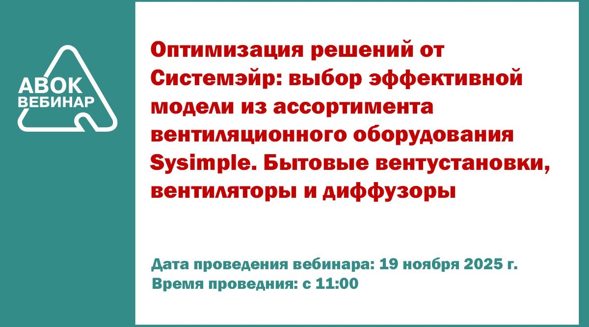 ✅ Вебинар АВОК "Оптимизация решений от Системэйр: выбор эффективной модели из ассортимента вентиляционного оборудования Sysimple. Бытовые вентустановки, вентиляторы и диффузоры" 📅 Дата проведения вебинара: 19 ноября 2025 года ⌚️ Время проведения: с 11-00 до 12-30 (время московское) 👨🎓 Лектор: Дудина Анастасия Александровна, продакт-менеджер компании Системэйр 📍 Программа вебинара: - Организация оптимального воздухообмена и здорового микроклимата в квартирах, таунхаусах и частных домах площадью до 400 кв. м. Серия бытовых вентиляционных установок SAVE. - Эффективная вентиляция без лишнего шума и затрат энергии. Правильный выбор вентиляторов с ЕС-двигателями и шумоизолированных моделей. - Безопасность и надежность в сложных условиях эксплуатации. Вентиляторы специального назначения: кислотостойкие для агрессивных сред и вентиляторы дымоудаления. - Обзор регуляторов постоянного и переменного расхода воздуха. Рекомендации по подбору для поддержания стабильного микроклимата и эконом