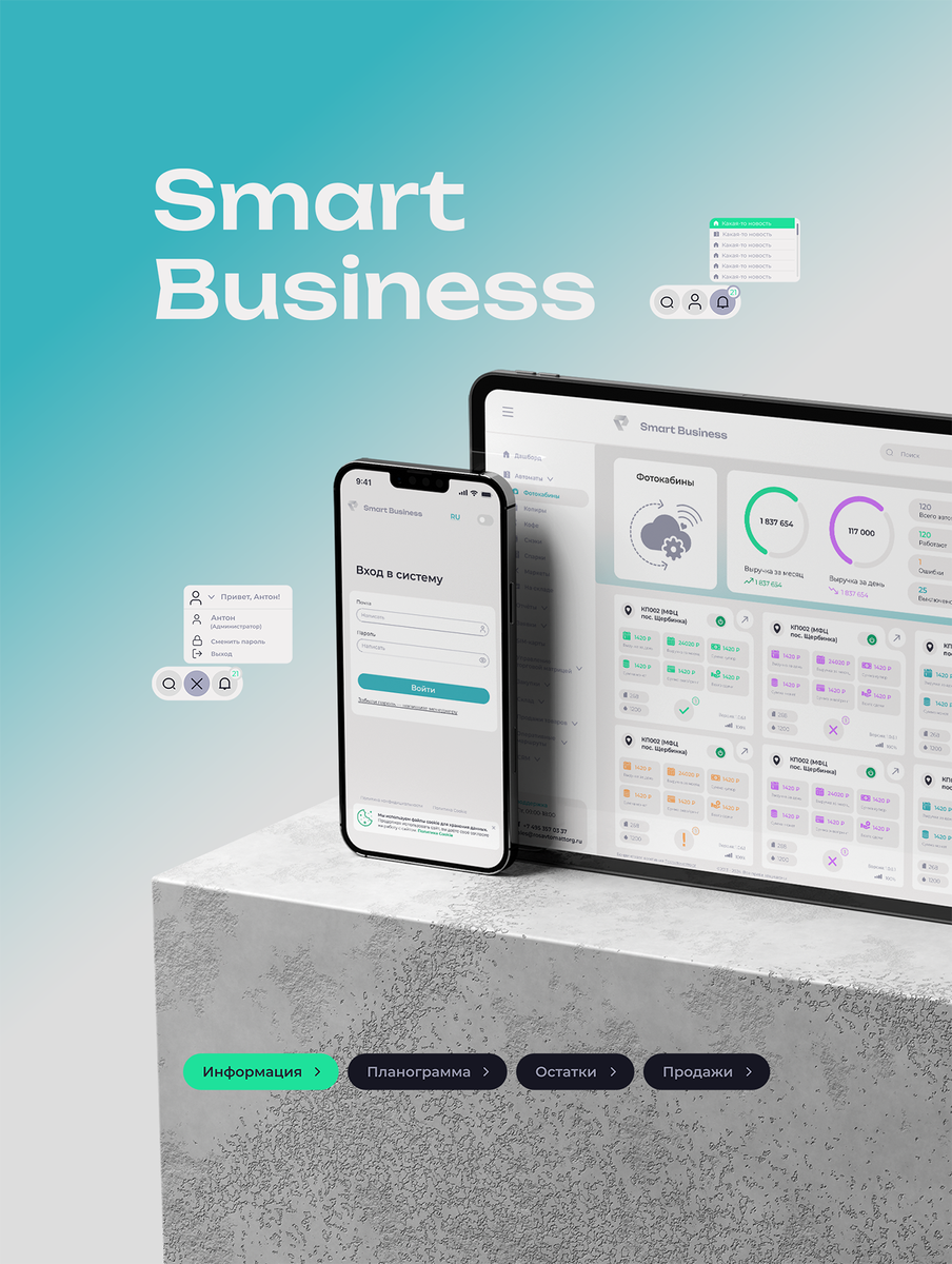 Вендинг — наша новая реальность. Сколько автоматов вы встречаете за день? Посчитайте — удивитесь! Тот факт, что вендинг — это выгодно, уже давно никто не оспаривает. Другое дело — управление автоматами, ведь владельцы часто устанавливают не один автомат, а три, семь или двадцать. Чтобы владельцам автоматов было удобно управлять целой экосистемой, мы разработали дизайн приложения, которое делает единовременный мониторинг. Всю информацию о загрузке, продажах, комплектации вендинговых аппаратов оператор видит с телефона — статистика собирается в интерактивные графики, диаграммы, таблицы. Информации по работе даже одного вендингового автомата довольно много, поэтому мы проявили всю свою инженерную и изобретательскую смекалку, чтобы объединить большие данные в простой, понятный, а главное — интуитивный интерфейс. Часто пользователю бывает необходимо увидеть работу нескольких автоматов одновременно, поэтому сверхзадачей было разместить отчёты о всех автоматах владельца на одном экране. Нереа