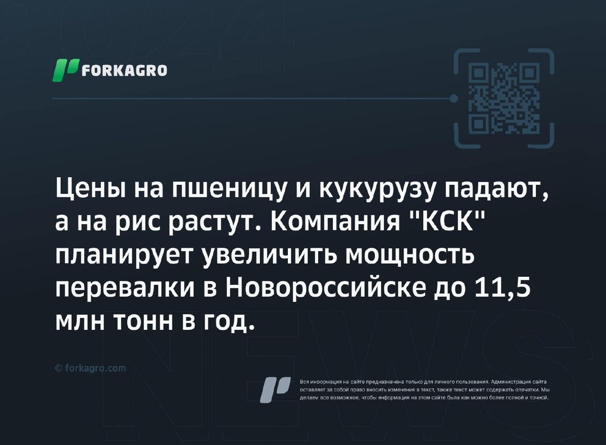 Цены на пшеницу и кукурузу падают, а на рис растут. Компания "КСК" планирует увеличить мощность перевалки в Новороссийске до 11,5 млн тонн в год. Мировые цены на пшеницу снизились за прошлую неделю, в то время как цена на кукурузу возросла. Индикативные цены России также показали некоторое снижение, за исключением роста цены на рис. Закупочные цены на пшеницу в портах Черного и Азовского морей также изменились. Компания "КСК" планирует увеличить мощность перевалки зерна, Россия увеличила экспорт пшеницы. Цены на российскую пшеницу падают из-за избыточного предложения. Перейти к источнику