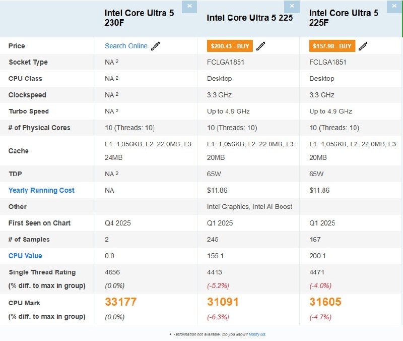 👀 Core Ultra 5 230F засветился в PassMark В базе данных PassMark появились результаты тестирования бюджетного процессора Core Ultra 5 230F, который является эксклюзивом для китайского рынка. 📌 Ключевые детали ⚙️ Характеристики 🛑 10 ядер , Cache L1: 1,056KB, L2: 22MB, L3: 24MB 🛑 Эксклюзив для Китая 🛑 Первые слухи о чипе появились в начале 2025 года 📊 Результаты PassMark 🛑 Одноядерный тест: 4656 баллов (+4 % к Core Ultra 5 225F — 4471 балл) 🛑 Многоядерный тест: 33 177 баллов (+5 % к Core Ultra 5 225F — 31 605 баллов) 🛑 Прирост относительно Core Ultra 5 225 без индекса F: 5–7 % Важнее для вас прирост производительности в 5–7 % или доступность процессора на мировом рынке? 🤷♂️ 🖥 Заказать сборку ПК в InterPC 🔒 Закрытый чат 🌐 Наши каналы 🗺 #Intеl