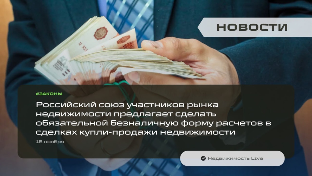 ⚡️ Российский союз участников рынка недвижимости предлагает сделать обязательной безналичную форму расчетов в сделках купли-продажи