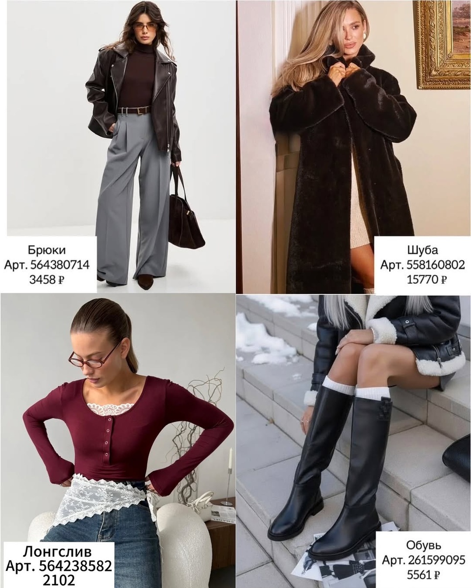 Эта подборка — настоящее сокровище для тех, кто любит сочетать комфорт и стиль. Я аккуратно разобрала каждую вещь на фото и подготовила подробные описания с советами стилиста. Всё строго по порядку, красиво и без единого иностранного слова — только настоящий, живой и выразительный русский язык. **✨ 1. Брюки Арт. 564380714 — 3458 ₽** Стильные широкие брюки с идеальной посадкой. Мягко ложатся по фигуре, создавая эффект длинных ног. Серый оттенок подчёркивает дороговизну образа и отлично сочетается как с базовыми, так и с насыщенными цветами. Совет стилиста: Носите их с кожаной курткой, водолазкой и высокими сапогами — такой образ вытягивает силуэт и делает его утончённым. **✨ 2. Шуба Арт. 558160802 — 15770 ₽** Роскошная длинная шуба глубокого шоколадного оттенка. Тёплая, густая и невероятно мягкая — идеальный выбор для морозной зимы. Образ сразу становится статусным. Совет стилиста: Лучше всего сочетается с лаконичными ботфортами и мини-платьем, создавая эффект смелой городской роскоши.