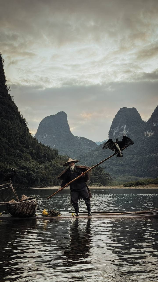 Утро началось с чего-то почти сказочного, Пещера Тростниковой флейты. Внутри огромные залы, сталактиты и сталагмиты, подсвеченные мягким разноцветным светом. Мы с гидом включили фантазию и начали искать в камнях фигуры, кто-то увидел слона, кто-то дракона, а кто-то даже многоножку. Потом — трансфер на пристань Янди и круиз на плоту по реке Лицзян. Плыли мимо карстовых гор и зелёных склонов, где всё вокруг кажется будто нарисованным. Это тот самый вид, что изображён на купюре 20 юаней — только вживую. Идеальная медитация на ходу. Закат, старый мастер с бакланами и мягкий свет заката, всё выглядело как сцена из старинной картины.