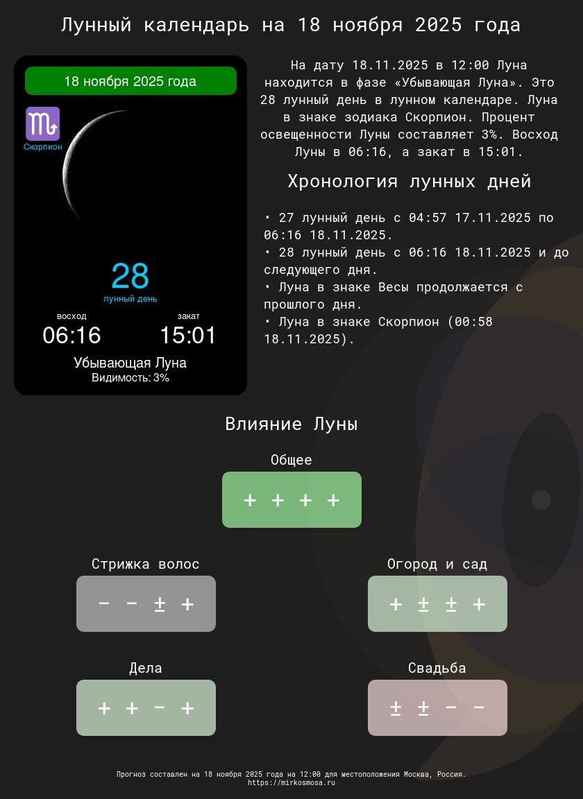 Лунные календари на 18 ноября 2025 года: Подготовьтесь к этому дню с учетом влияния Луны! 🔹🌗 Лунный календарь на 18 ноября 2025 года — Что приготовила Луна? Подробнее https://mirkosmosa.ru/lunar-calendar/phase-moon/2025/november/18 🔹✂️ Лунный календарь стрижек на 18 ноября 2025 года — Подходящий ли день для обновления прически? Подробнее https://mirkosmosa.ru/lunar-calendar/haircut/2025/november/18 🔹🌱 Лунный календарь огородника и садовода на 18 ноября 2025 года — Лучшее время для ухода за растениями. Подробнее https://mirkosmosa.ru/lunar-calendar/garden/2025/november/18 🔹📅 Лунный календарь дел на 18 ноября 2025 года — Удачные моменты для важных задач. Подробнее https://mirkosmosa.ru/lunar-calendar/work/2025/november/18 🔹💍 Лунный календарь свадеб на 18 ноября 2025 года — Подходит ли этот день для вашего торжества? Подробнее https://mirkosmosa.ru/lunar-calendar/wedding/2025/november/18