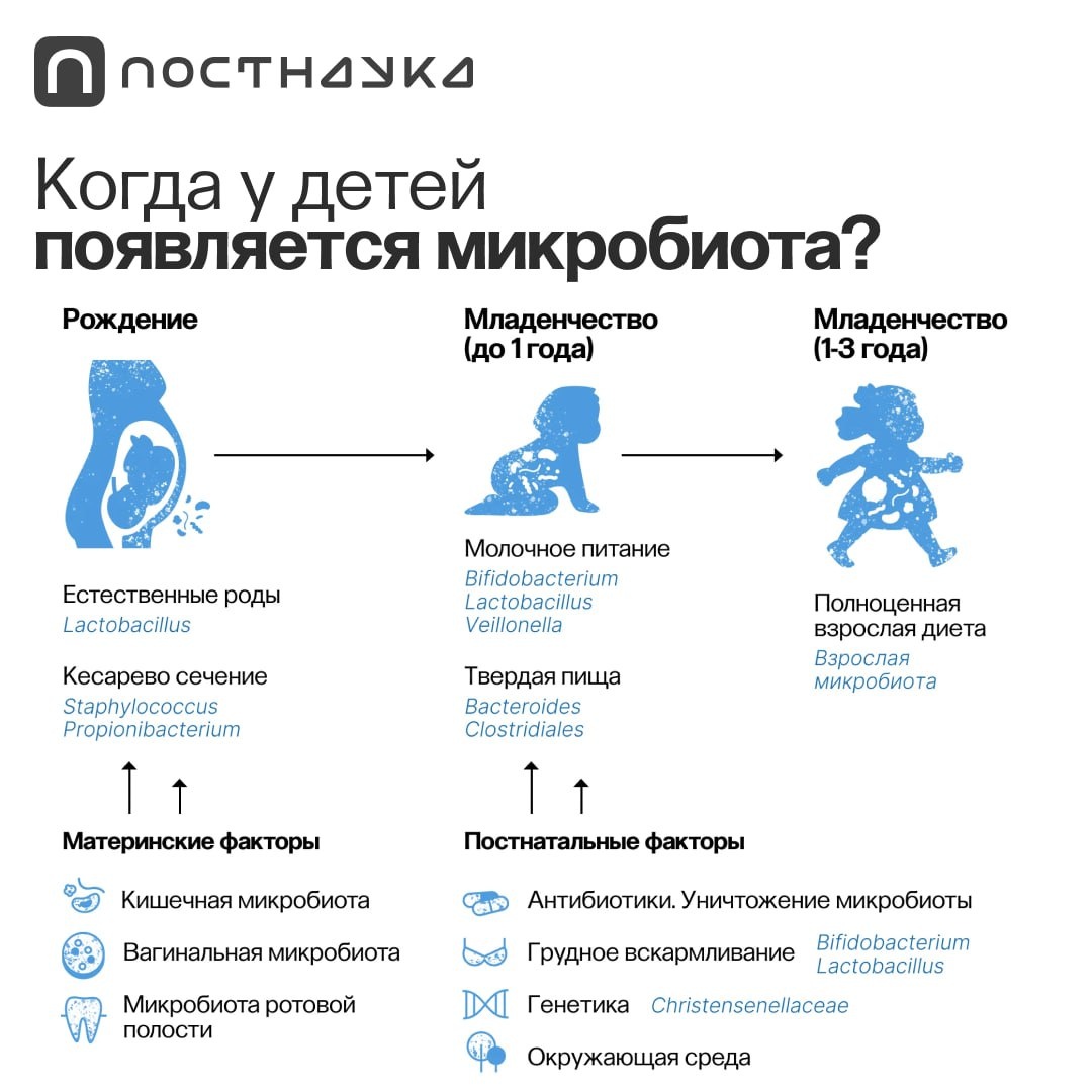 Ученых давно интересовал вопрос — есть ли у ребенка в утробе микробиота и в какой момент она появляется. Исследования показывают, что отдельные микробы в ЖКТ плода существуют — они попадают туда из внутриутробных источников, но ведут себя не очень активно и почти не размножаются, потому что для них там нет еды. Получается, что до рождения малыш с этой точки зрения стерилен. Зато потом начинается активное развитие микробиома. Так, в первые сутки жизни новорожденных быстро растут колонии кишечной палочки и энтерококков, на вторые сутки преобладают лактобациллы, а на третьи — уже бифидобактерии. Гид «Наука питания» о том, почему здоровье начинается в тарелке: https://postnauka.org/guides/156241