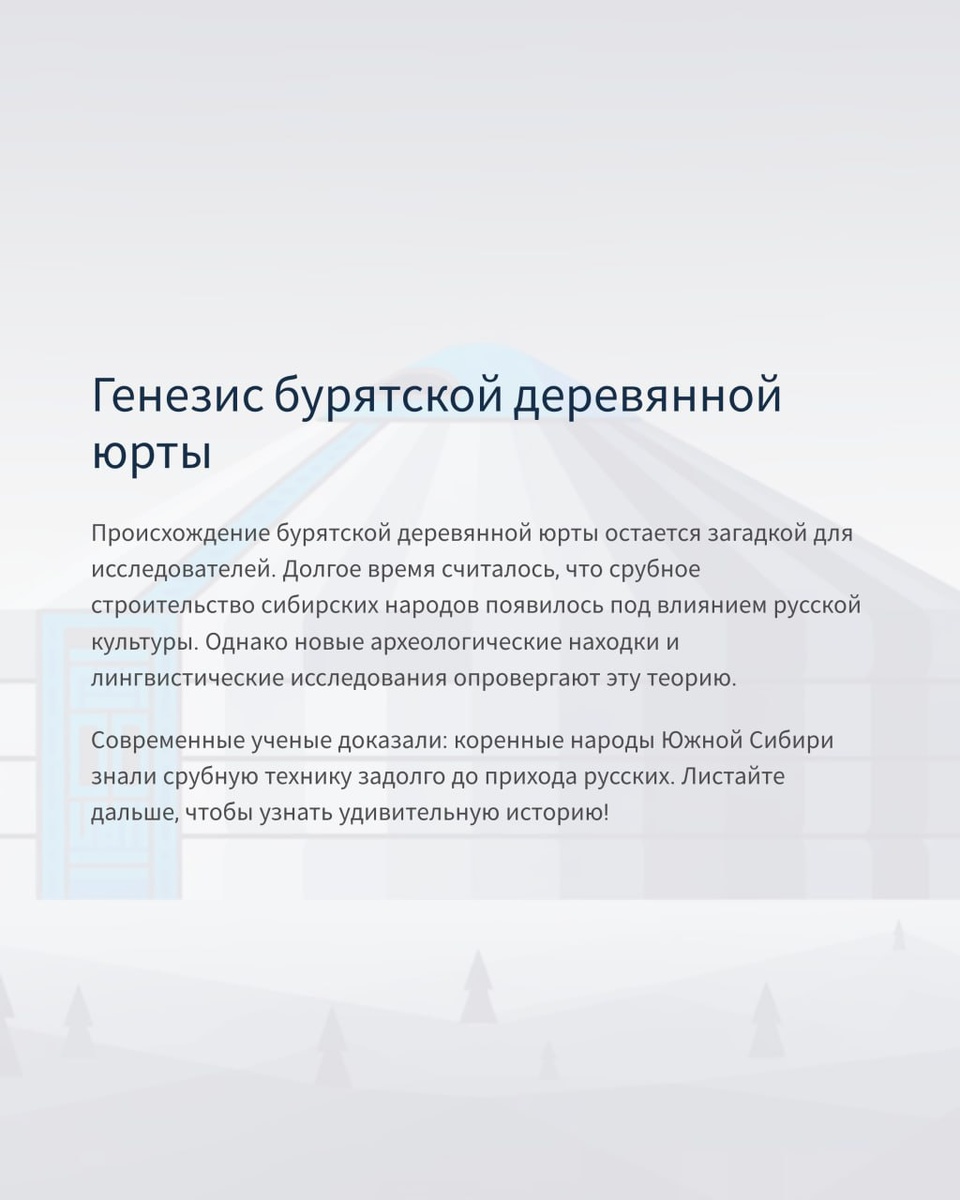 Генезис бурятской деревянной юрты Происхождение бурятской деревянной юрты остается загадкой для исследователей. Долгое время считалось, что срубное строительство сибирских народов появилось под влиянием русской культуры. Однако новые археологические находки и лингвистические исследования опровергают эту теорию. Современные ученые доказали: коренные народы Южной Сибири знали срубную технику задолго до прихода русских. Листайте дальше, чтобы узнать удивительную историю! Больше о бурятской культуре и истории в нашем канале 👉 https://t.me/universe_buryat Наша группа https://t.me/biznet_place