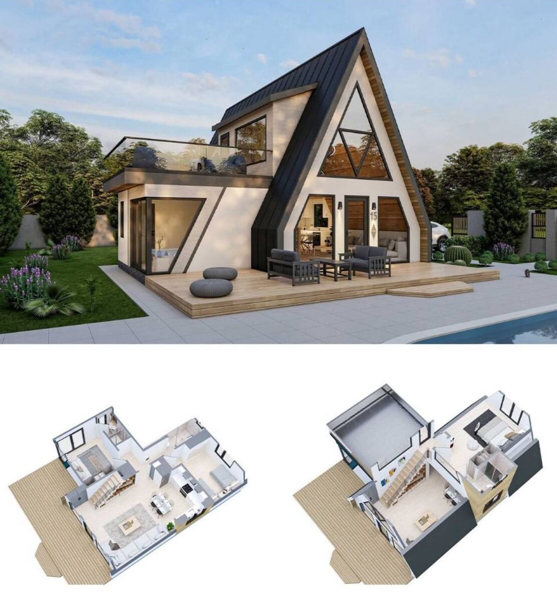 Очень функциональный А-фрейм подойдёт как под сдачу в аренду для компании из нескольких семей, так и постоянного проживания