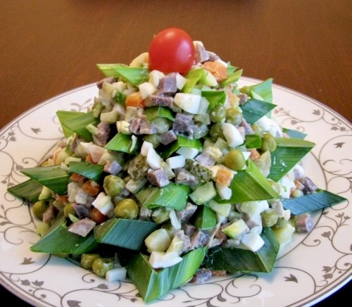 Огурцы и отварной язык нарежьте кубиком. Всё смешайте. Добавьте по вкусу лимонный сок (можно и без него) и заправьте майонезом. Если будете оформлять салат в виде елочки, выложите его горкой на сервировочное блюдо, уплотните. Из