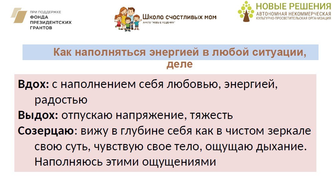 ΠΎΠΆΡ ΠΈ Π½Π°Π·ΡΠ²Π°Ρ ΠΏΠΎΡΡΠ΅Π±Π½ΠΎΡΡΡ. 5. ΠΠ΅Π»Π°Ρ ΠΎΡΠΎΠ·Π½Π°Π½Π½ΡΠΉ Π²ΡΠ±ΠΎΡ: Ρ ΠΌΠ°ΠΌΠ°, Π° Π½Π΅ ΠΊΡΠΎΠΊΠΎΠ΄ΠΈΠ»! π€«ΠΠ° Π·Π°Π½ΡΡΠΈΠΈ ΡΠ°Π·ΠΎΠ±ΡΠ°Π»ΠΈ Π½Π΅ΡΠΊΠΎΠ»ΡΠΊΠΎ ΠΏΡΠΈΠΌΠ΅ΡΠΎΠ², ΠΊΠ°ΠΊ Π²Π·ΡΡΡ ΠΎΡΠ²Π΅ΡΡΡΠ²Π΅Π½Π½ΠΎΡΡΡ Π·Π° ΡΠ²ΠΎΠΈ ΡΠΌΠΎΡΠΈΠΈ Π² ΡΡΡΠ΄Π½ΠΎΠΉ, ΡΠ°Π·Π΄ΡΠ°ΠΆΠ°ΡΡΠ΅ΠΉ ΡΠΈΡΡΠ°ΡΠΈΠΈ. Π§ΡΠΎΠ±Ρ Π²ΠΎΠ²ΡΠ΅ΠΌΡ ΠΎΡΡΠ°Π½ΠΎΠ²ΠΈΡΡΡΡ ΠΈ Π½Π΅ Π΄ΠΎΠΏΡΡΡΠΈΡΡ Π°Π²ΡΠΎΠΌΠ°ΡΠΈΡΠ΅ΡΠΊΡΡ ΡΠ΅Π°ΠΊΡΠΈΡ, ΠΈΡΠΏΠΎΠ»ΡΠ·ΡΠΉΡΠ΅ ΠΏΡΠ°ΠΊΡΠΈΠΊΡ Β«ΠΠ°ΡΠ·Π° Π² ΠΌΠΎΠΌΠ΅Π½ΡΠ΅Β». π‘Π‘Π»Π΅Π΄ΡΡΡΠΈΠΉ Π²ΠΎΠΏΡΠΎΡ, ΠΊΠΎΡΠΎΡΡΠΉ ΠΎΠ±ΡΡΠ΄ΠΈΠ»ΠΈ Π½Π° ΠΏΡΠ°ΠΊΡΠΈΠΊΡΠΌΠ΅: ΠΊΠ°ΠΊ Π½Π°ΠΏΠΎΠ»Π½ΡΡΡΡΡ ΡΠ½Π΅ΡΠ³ΠΈΠ΅ΠΉ? ΠΡΡΡ Π½Π΅ΡΠΊΠΎΠ»ΡΠΊΠΎ Π²ΠΈΠ΄ΠΎΠ² ΡΠ½Π΅ΡΠ³ΠΈΠΈ: - ΡΠΈΠ·ΠΈΡΠ΅ΡΠΊΠ°Ρ; - ΡΠΌΠΎΡΠΈΠΎΠ½Π°Π»ΡΠ½Π°Ρ; - Π΄ΡΡ