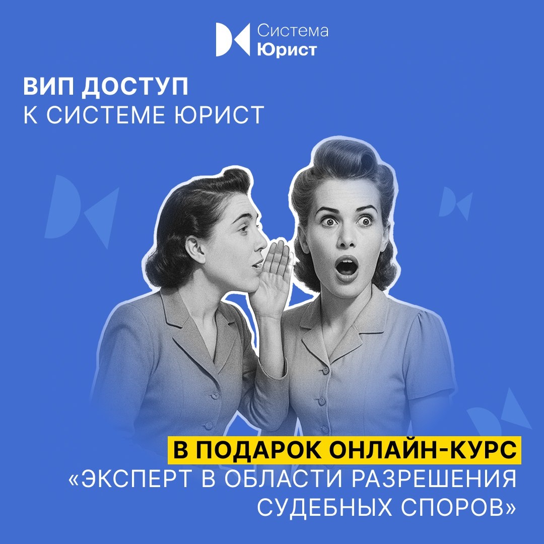 При оформлении годовой подписки на Систему Юрист до конца месяца дарим онлайн-курс «Эксперт в области разрешения судебных споров» в Высшей школе Юрист Компании ➡️ Прокачайте навыки судебного юриста на практикумах от ведущих экспертов и получите удостоверение о повышении квалификации установленного образца. 📌 Оставьте заявку на льготный счет по ссылке, менеджер перезвонит в течение дня. Он откроет полный доступ для тест-драйва Системы Юрист, расскажет, что входит в подписку, и отправит коммерческое предложение с обучением в подарок Оставить заявку