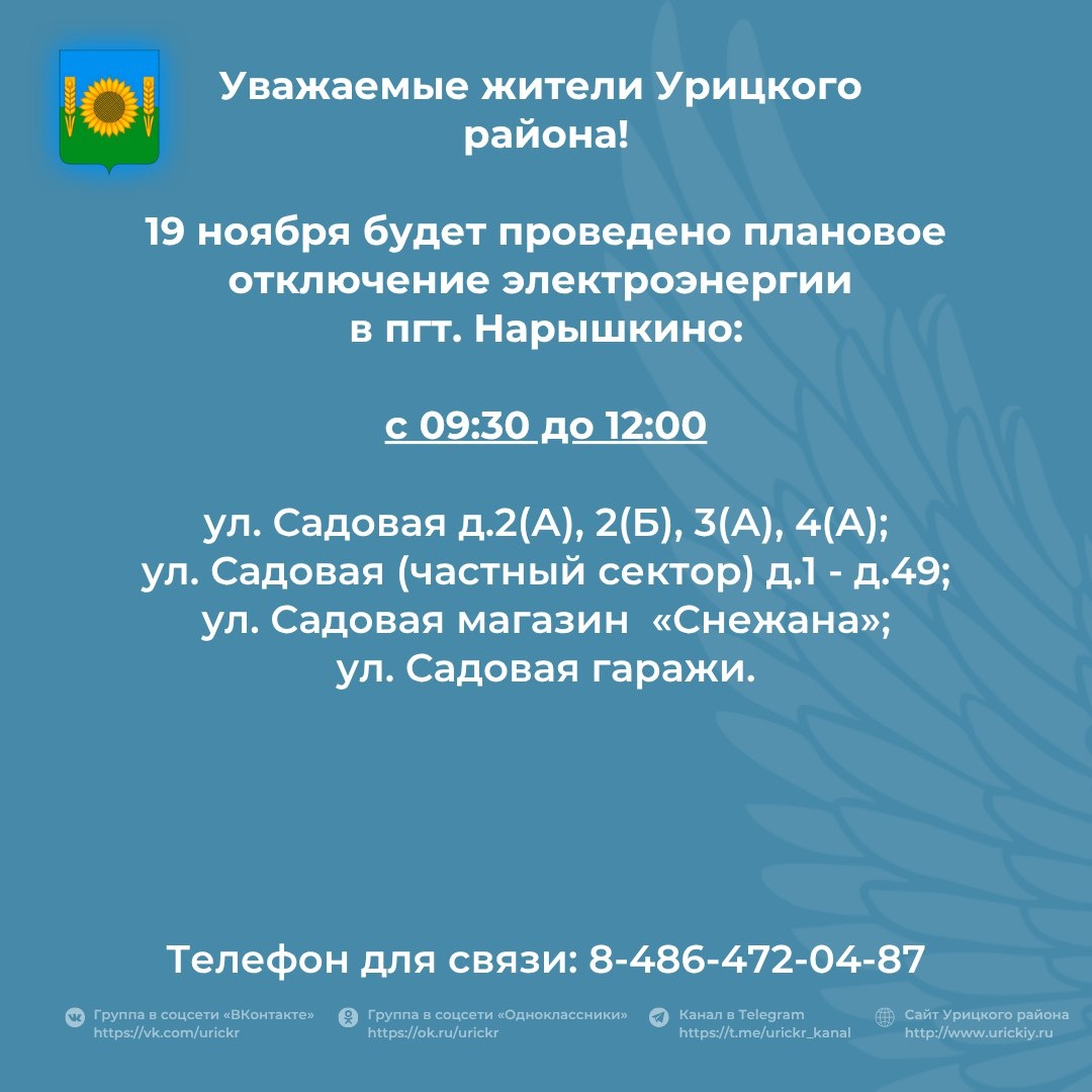 Уважаемые жители Урицкого района! 📢 19 ноября будет проведено плановое отключение электроэнергии в поселке Нарышкино. Все подробности в карточках ⬆ #УрицкийРайон #АдминистрацияУрицкогорайонаОрловскойобласти