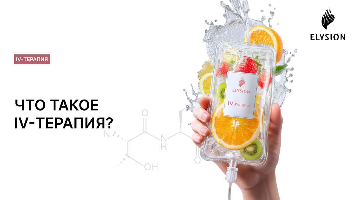 IV-терапия (инфузионная терапия) — это современный метод лечения, при котором лекарственные препараты, витамины и минералы через внутривенную капельницу вводятся непосредственно в кровь. Полезные вещества минуют пищеварительную систему и за счет этого полностью усваиваются организмом. Процедура проводится под контролем квалифицированного врача и занимает от 30 до 60 минут. IV-терапия назначается при состояниях, требующих быстрого восполнения дефицита питательных веществ или целенаправленного воздействия на организм. Основные показания: 1. Полная биодоступность активных компонентов 2. Мгновенное поступление лекарственных веществ в кровь. 3. Моментальное восполнение дефицита витаминов и микроэлементов. 4. Эффективная детоксикация и очищение организма. 5. Укрепление иммунной защиты организма. 6. Нормализация работы нервной и сердечно-сосудистой систем. 7. Усиление регенеративных способностей тканей. 8. Выраженное антиоксидантное и омолаживающее действие. Клиника «Elysion» предлагает совре