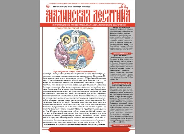 «Малинская десятина», интернет-газета, выпуск № 09 (38), 2025 г. Официальная газета Малинского благочиния «Малинская десятина» издаётся по благословению архиепископа Подольского и Люберецкого Аксия в форме сетевого (электронного) издания. Опубликован девятый номер интернет-газеты «Малинская десятина» за 2025 г. Тема номера: «Рождество Пресвятой Богородицы». #Малинская_десятина #Малинское_благочиние https://clck.ru/3QNN9g