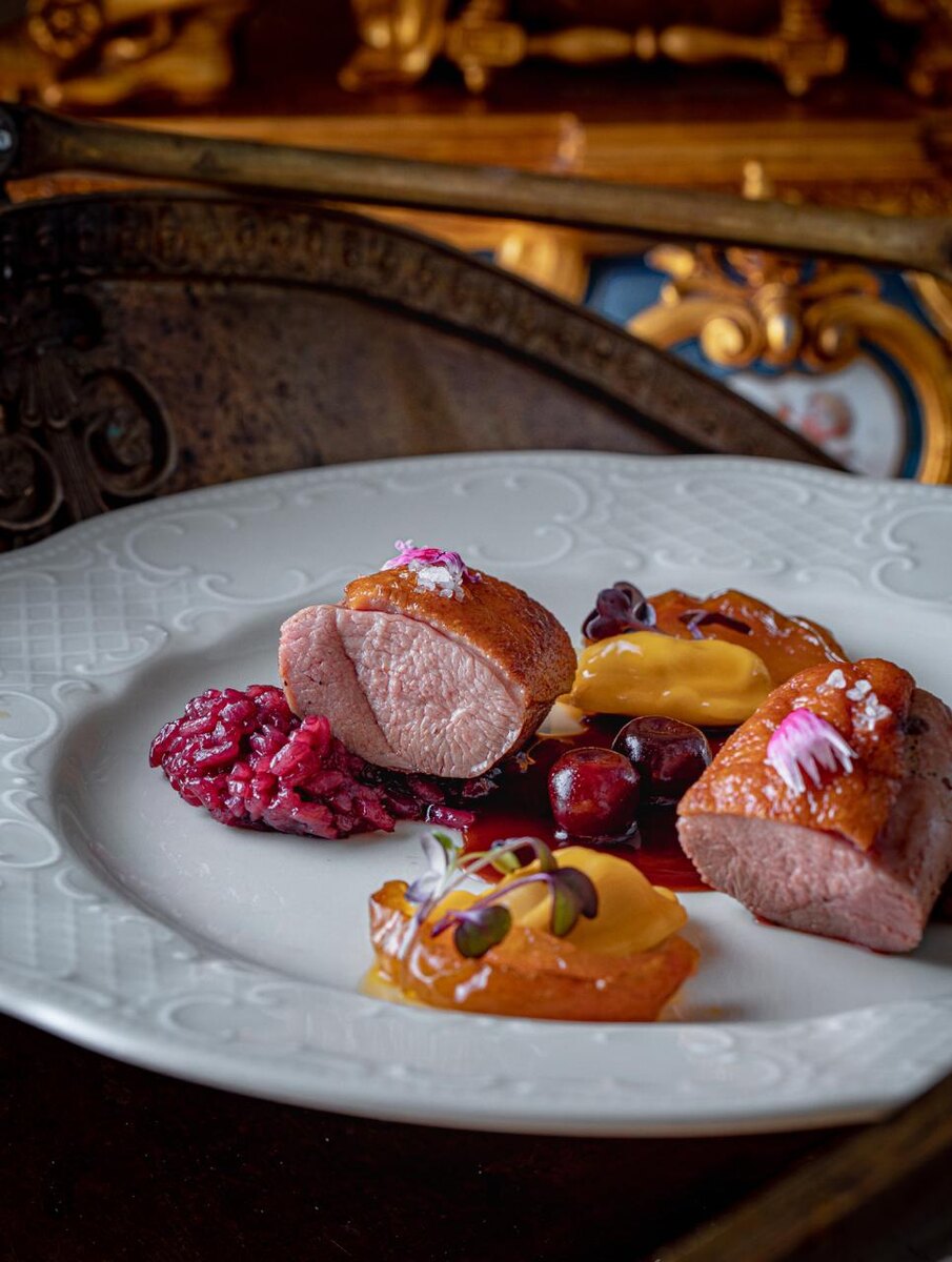 Утиная грудка с вишневым соусом и равиоли Жареная утиная грудка под соусом из крепкого мясного бульона, вишневого сока и вишни гриотин. Подаем с вишневым ризотто, равиоли с фуа-гра в апельсиновой глазури и конфи из груши с апельсиновым вареньем. Забронировать стол