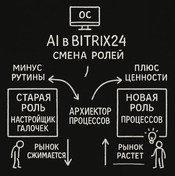... я стою в зале и смотрю на демонстрацию нового релиза Битрикс24. На экране бегают Ai агенты, система сама предлагает сценарии, автоматически собираются процессы, а зал то хлопает, то тихо переглядывается. Кто-то рядом шепчет коллеге "Ну всё, скоро нас как настройщиков точно заменят". А кто-то наоборот записывает идеи и уже видит новые возможности. Чтобы понять, что реально происходит, полезно отлепиться от конкретных фич и посмотреть на вектор. Несколько лет назад Битрикс24 для большинства был просто ЦРМ + корпоративный портал. Сегодня команда продукта фактически строит операционную систему компании. В одном окне собираются коммуникации, задачи, продажи, документы, сотрудники, обучение, отчёты и теперь ещё слой Ai агентов. Логика простая и довольно жёсткая. Чем больше процессов живёт внутри одной экосистемы, тем меньше смысла у отдельных маленьких сервисов и зоопарка вокруг. Чем проще запустить нужную функцию из коробки, тем меньше ценность у тех, кто зарабатывает на ручной н