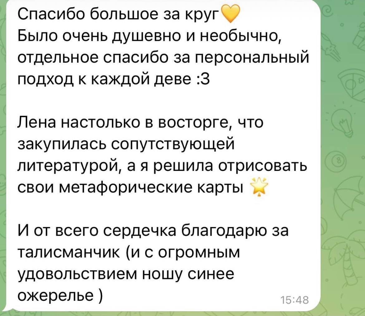 Когда женщины собираются в круг — рождается особое волшебство ✨ После встреч участницы делятся самым сокровенным: ✨ как «вернулись к себе» ✨ ощутили «крылья за спиной» ✨наполнились энергией, которой хватило на свершения. Да еще на какие!!! Одна из женщин вдохновилась на отрисовку собственных метафорических карт 😍 Как точно заметила одна участница: «Прекрасно, что в нашем вечно бегущем обществе есть такие теплые уголки, которые нежно согревают душу». Следите за анонсами следующих встреч — вместе мы создадим ещё больше волшебства 🥳 #отзывы