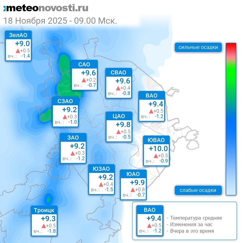 В 9:00 в Москве было от +8.3°C до +10.3°C, средняя температура +9.5°C #погода #Москва #осень #температура #18ноября #вторник